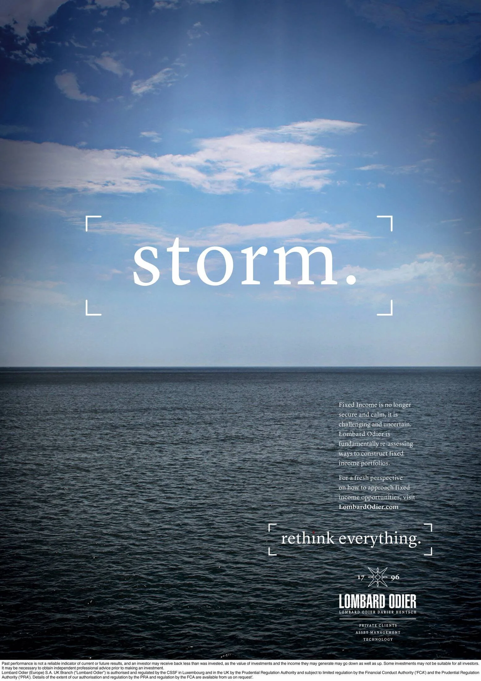 In 2016, I led the creative new business pitch for Lombard Odier, an independent Swiss investment bank. The winning idea recognised that a small investment bank can't directly compete with big names such as UBS and Pictet on branding, but it could be famous for a point of view. Recognising that as an independent bank it can be more agile than others, framing it as an organisation that could constantly re-evaluate the markets and advise clients more effectively proved a successfully move. The campaign line of 'Rethink Everything' encourages the audience to stand back and take a fresh perspective on an unpredictable world.