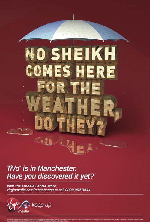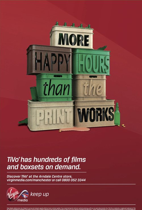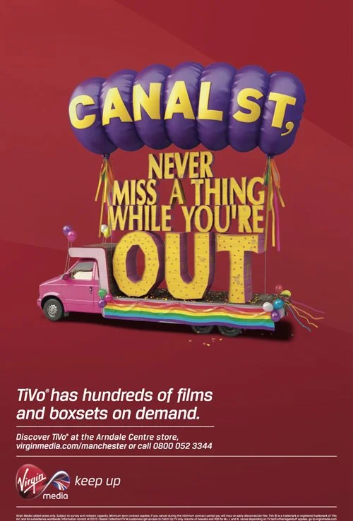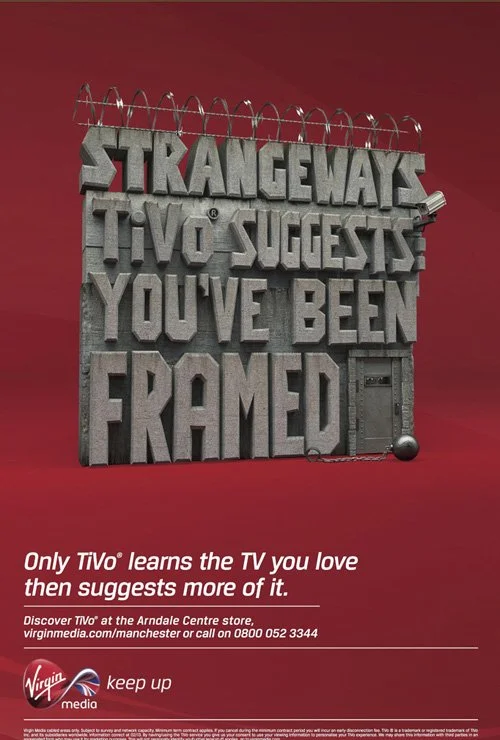 Print campaign that was focussed on and displayed entirely in Manchester. Local areas and infamous stories about the city were exploited for amusing messaging to showcase Virgin Media's TiVo service.